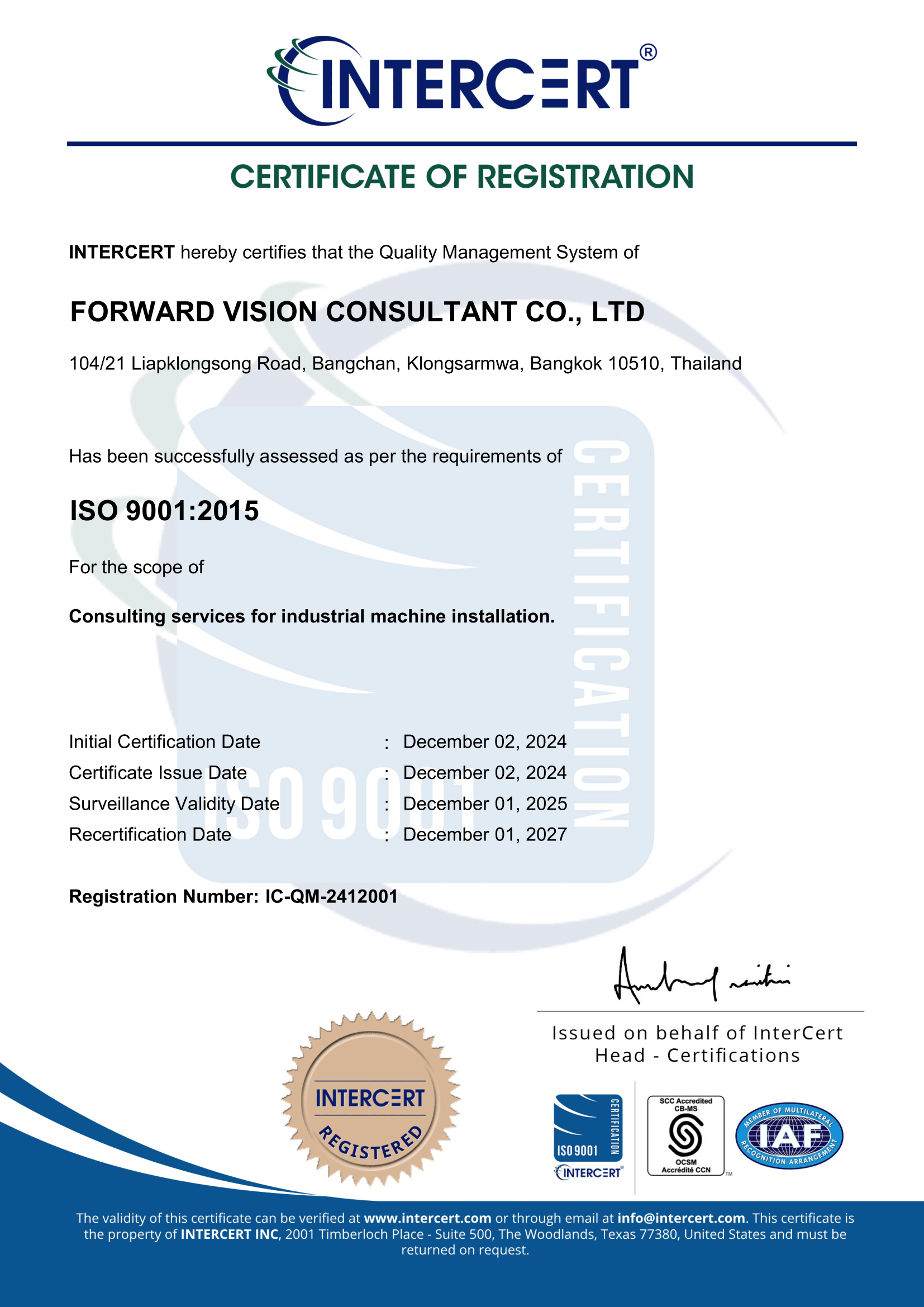 Company : FORWARD VISION CONSULTANT CO., LTD ที่อยู่ : 104/21 Liapklongsong Road, Bangchan, Klongsamwa, Bangkok 10510 Thailand มาตรฐาน : ISO 9001:2015 • หน่วยรับรอง : INTERCERT Registration No.: IC-QM-2412001