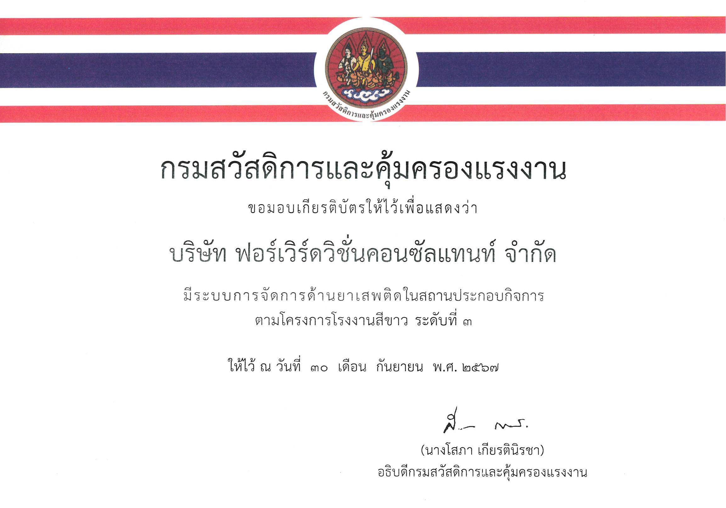 กรมสวัสดิการและคุ้มครองแรงงาน (กระทรวงแรงงาน) มอบเกียรติบัตรรับรองว่า FVC มีระบบการจัดการด้านยาเสพติดในสถานประกอบกิจการที่มีประสิทธิภาพ ครอบคลุมการป้องกัน–เฝ้าระวัง–แก้ไข และการดูแลพนักงานตามระเบียบกฎหมาย โดยได้รับมอบเมื่อวันที่ 30 กันยายน 2567 สะท้อนความมุ่งมั่นในการสร้างสถานประกอบการปลอดยาเสพติดและสภาพแวดล้อมการทำงานที่ปลอดภัยอย่างยั่งยืน
